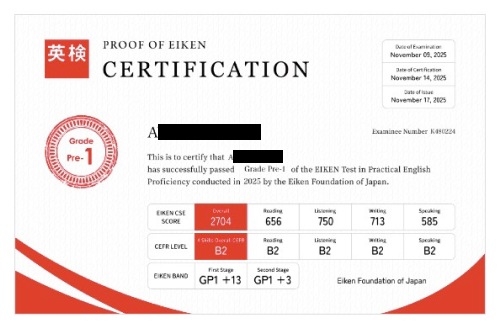 英検準1級の取得で受験が有利になり、英語に対する自信もつきました。次はさらにスキルアップを目指し、英検1級取得に挑戦します!